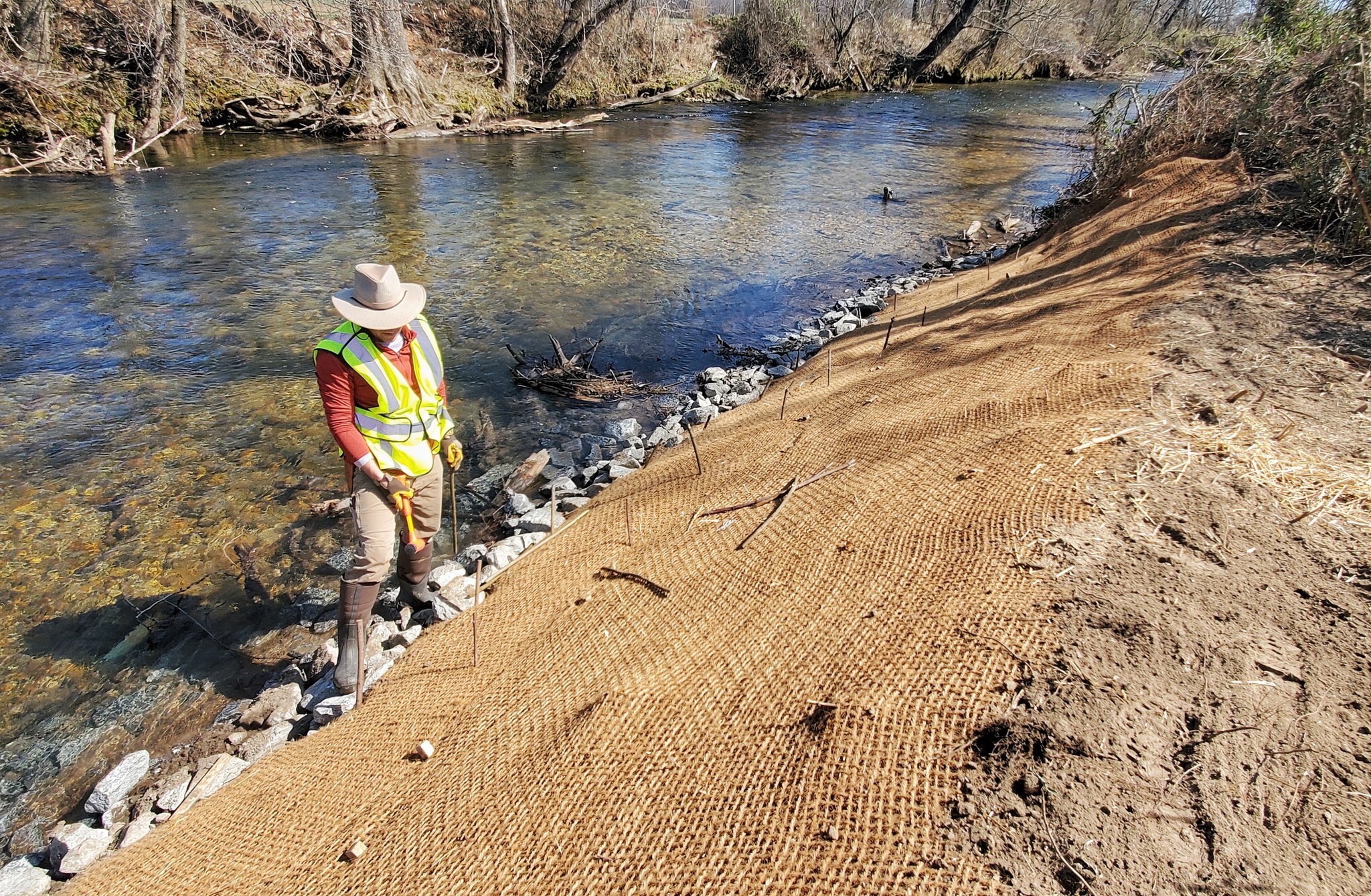 Biodegradable burlap/jute erosion fabric can be used to stabilize soils while seeded native grasses germinate.