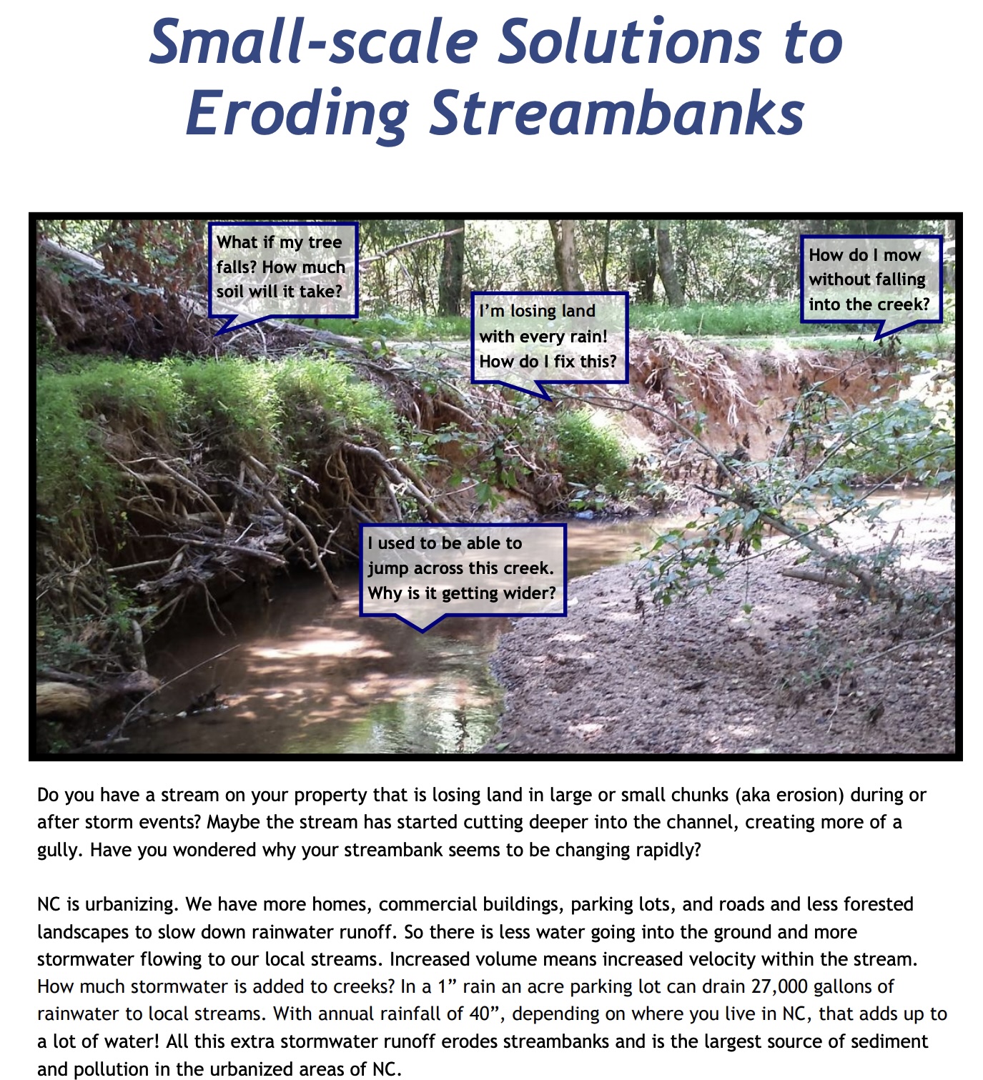 Learn more about remediating eroding streambanks by checking out the NC State ‘Small Scale Solutions to Eroding Streambanks‘ publication.