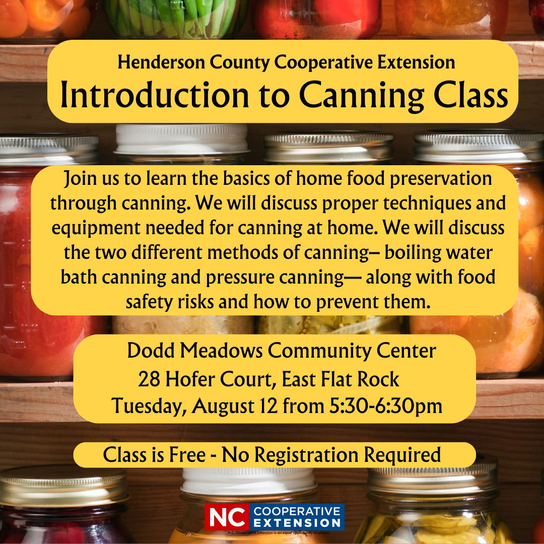 An additional Introduction to Canning Class will be held at Dodd Meadows Community Center on Tuesday, August 12 from 5:30–6:30 p.m.