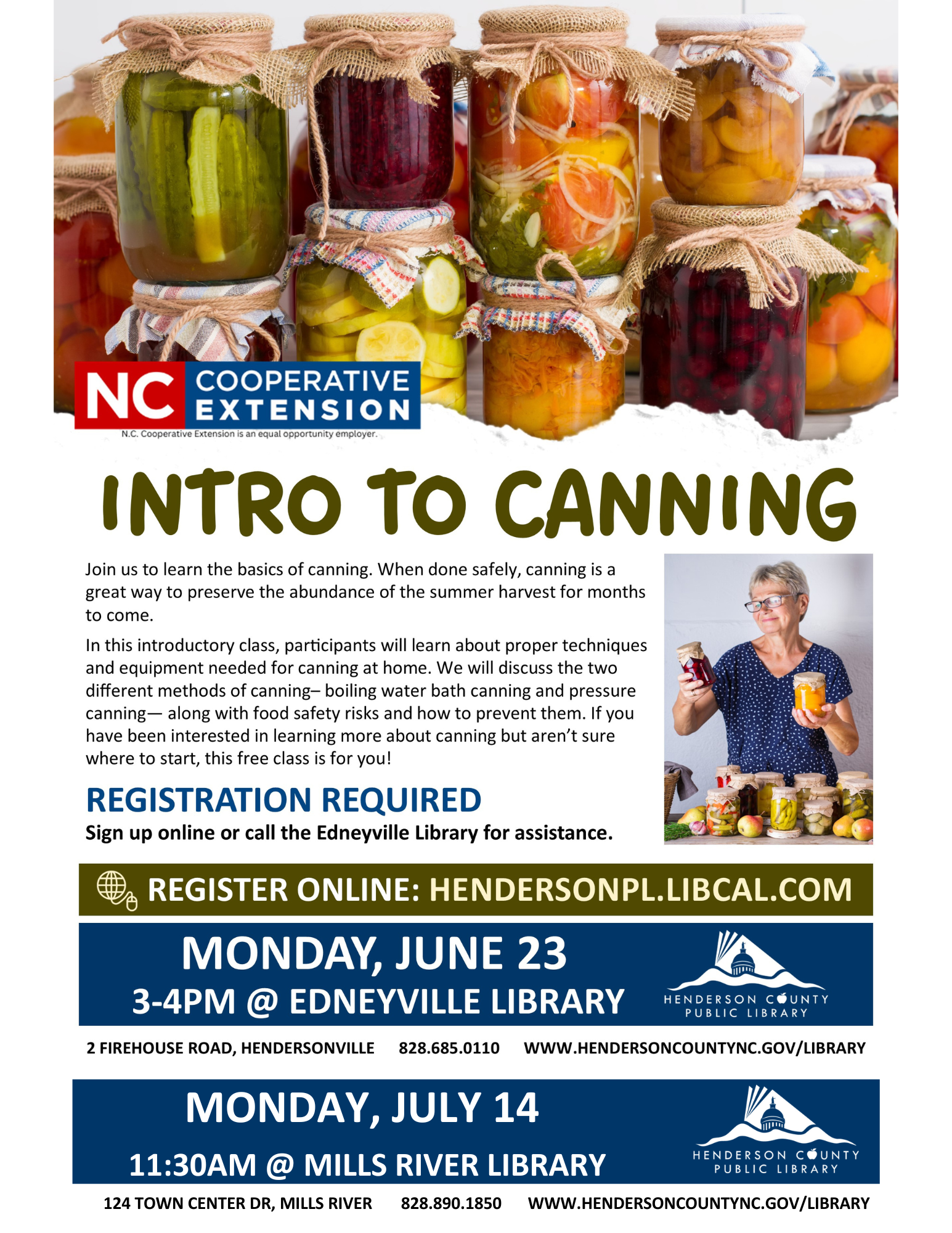 Collapse ▲Interested in learning more about canning but not sure where to start? Join us for these introductory classes on canning. There will be three different opportunities to attend an Introduction to Canning class at one of the library branches. These classes are free and will cover the basics of canning from supplies to techniques and recipes.