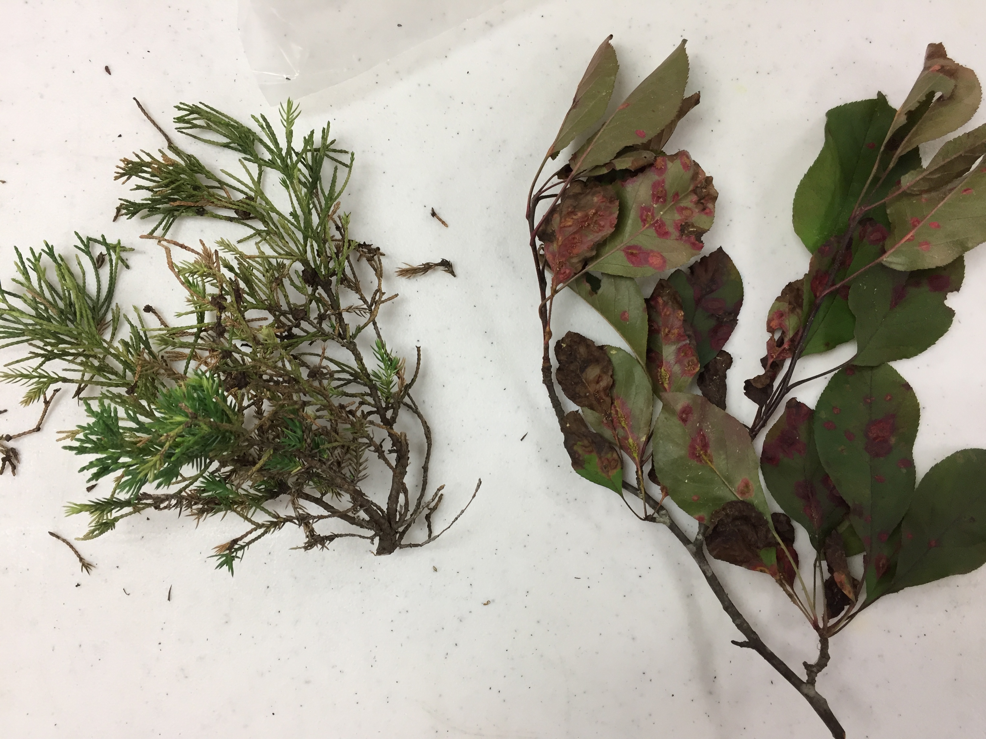 Problems Apple trees can have Cedar-apple rust. This is a fungal disease that spends part of its time on cedars and part on apples. On apples, it appears as spots on the leaves. On cedars and other junipers, it appears as marble to golf ball-sized galls that exude orange tendrils or spores. The best option for control is to remove the nearby cedars.