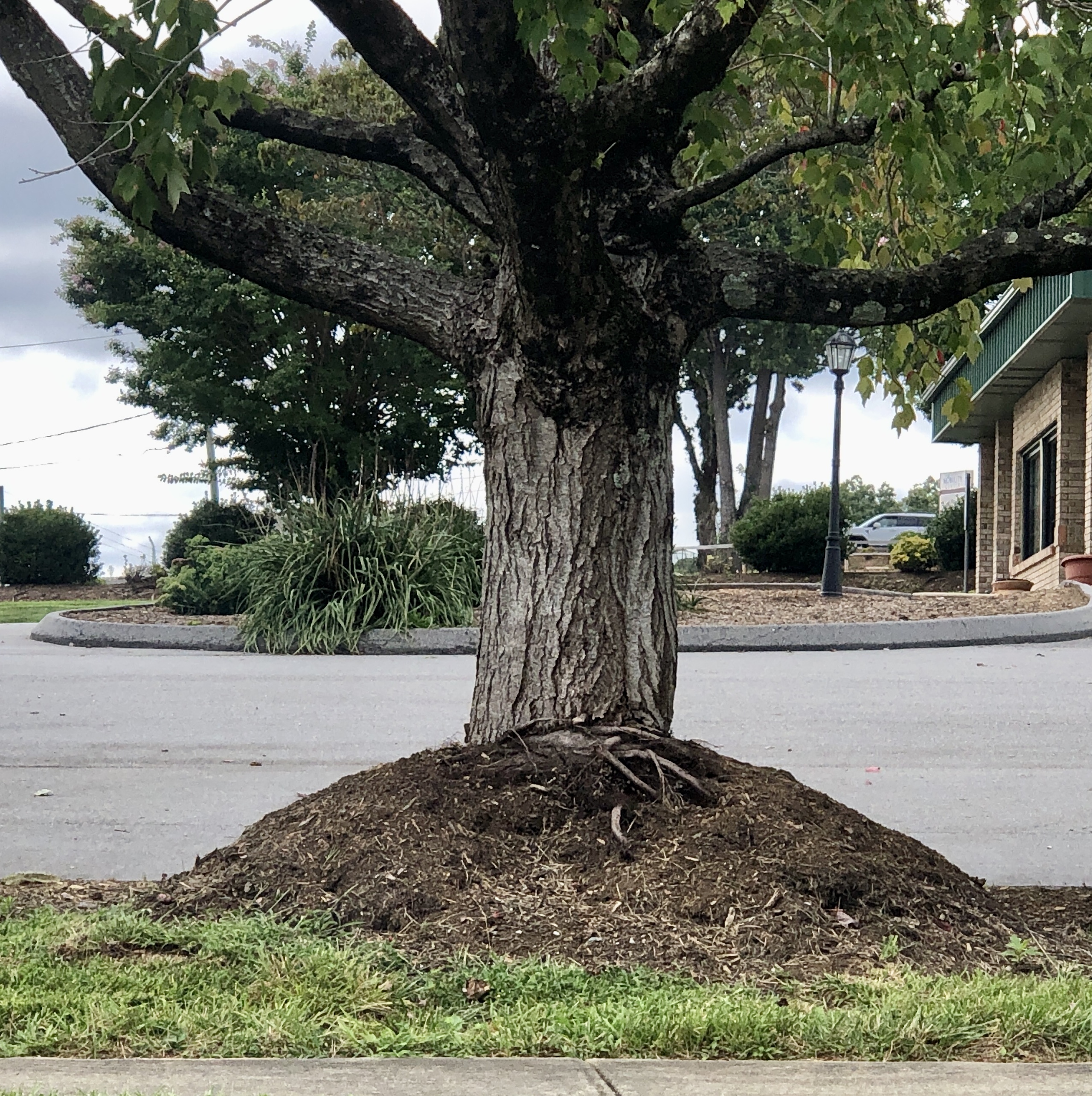 Mulch piled this high starts to compost. The decomposition of the mulch causes heat that can damage the wood of the tree and roots. Also this ‘volcano mulching’ holds moisture against the bark causing rot.