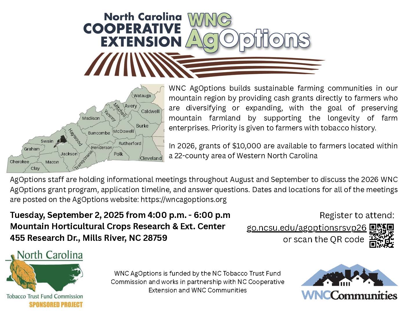 The 2026 cycle is made possible through the generous and continued funding of the North Carolina Tobacco Trust Fund Commission (NCTTFC), whose commitment to supporting agriculture in the state remains unwavering. Thanks to the Commission’s renewed investment, the WNC AgOptions program is secured through 2027.