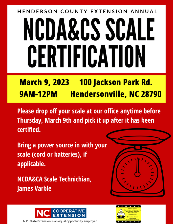 March 9, 2023 from 9 a.m. to 12 noon, James Varble, NCDA&CS Standards Inspector III will be at the North Carolina Cooperative Extension Henderson Center to certify your market scale for the upcoming season.
