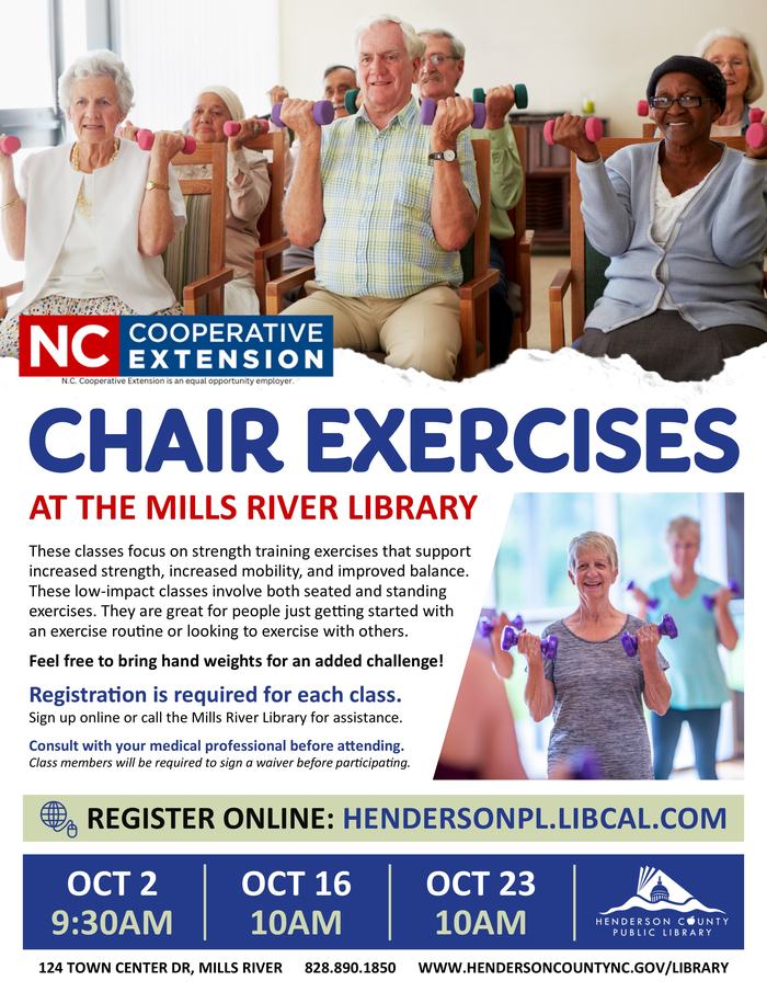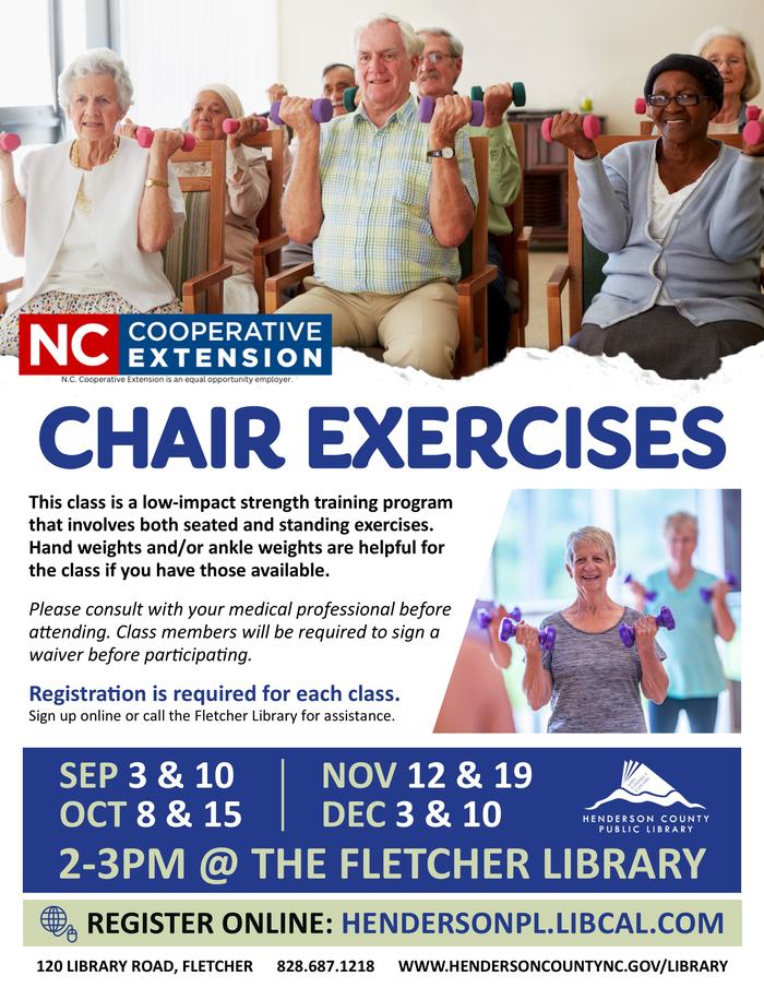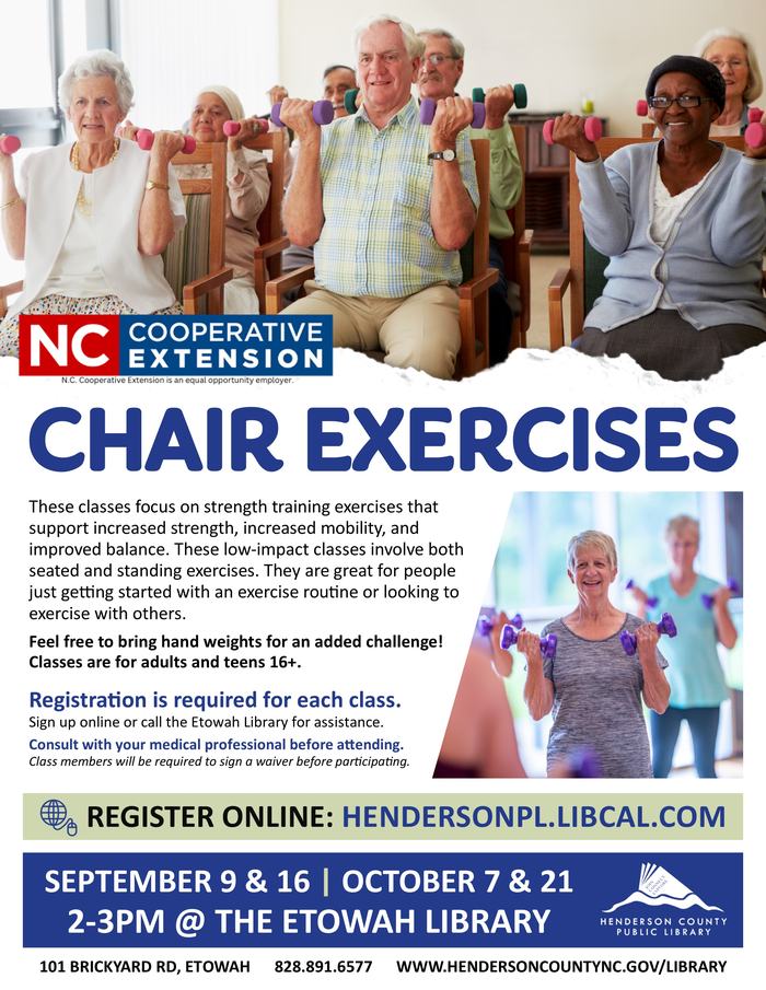 As the weather starts to cool down, come warm up with these chair exercise classes at the Etowah, Fletcher and Mills River Libraries.
