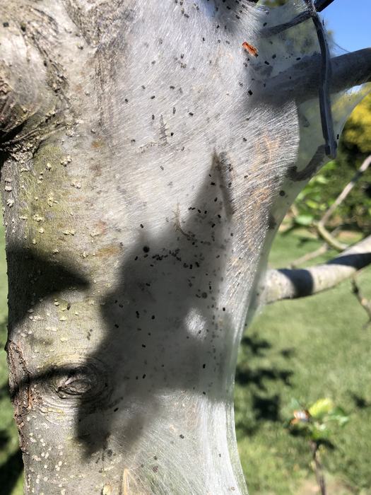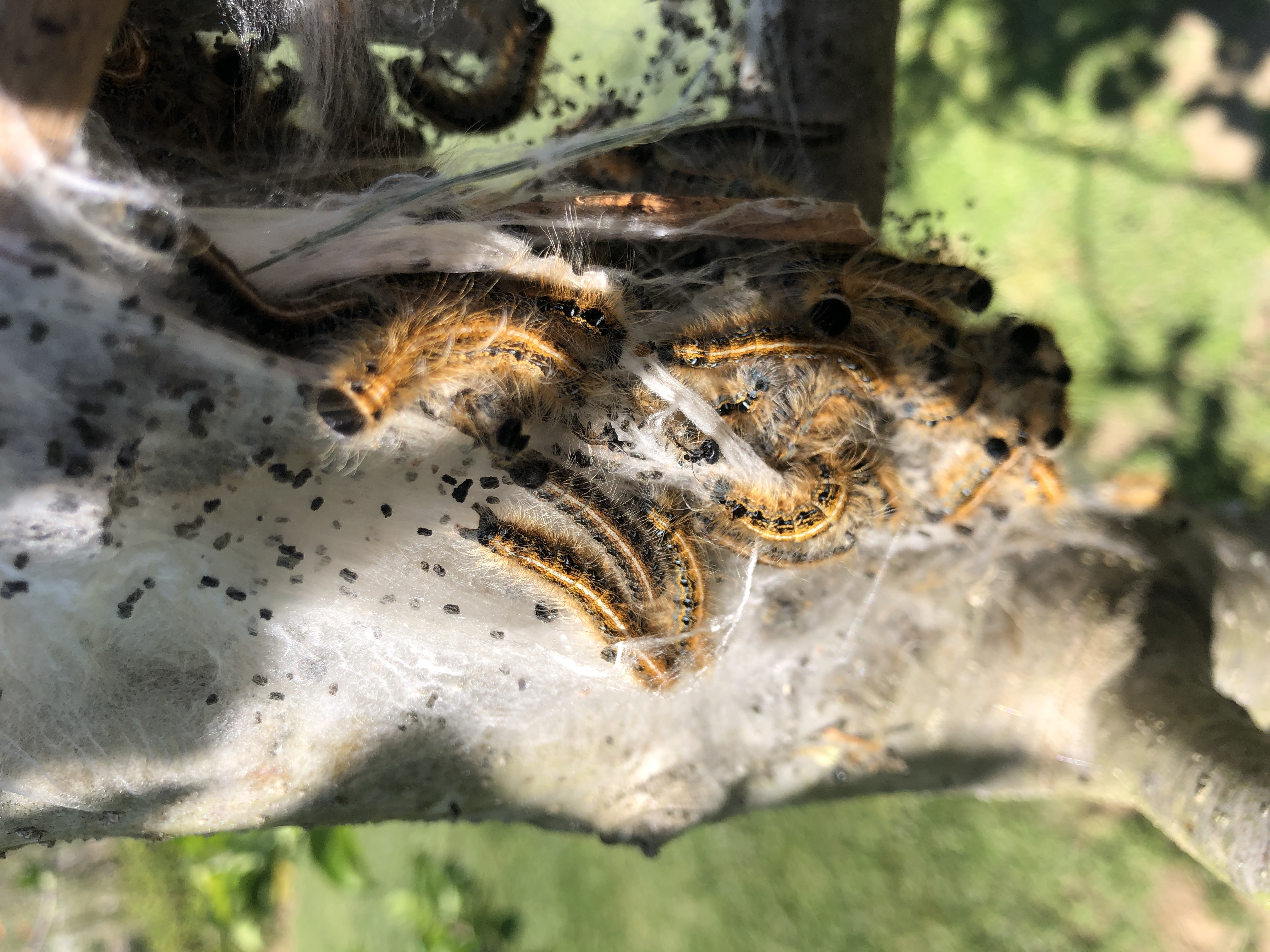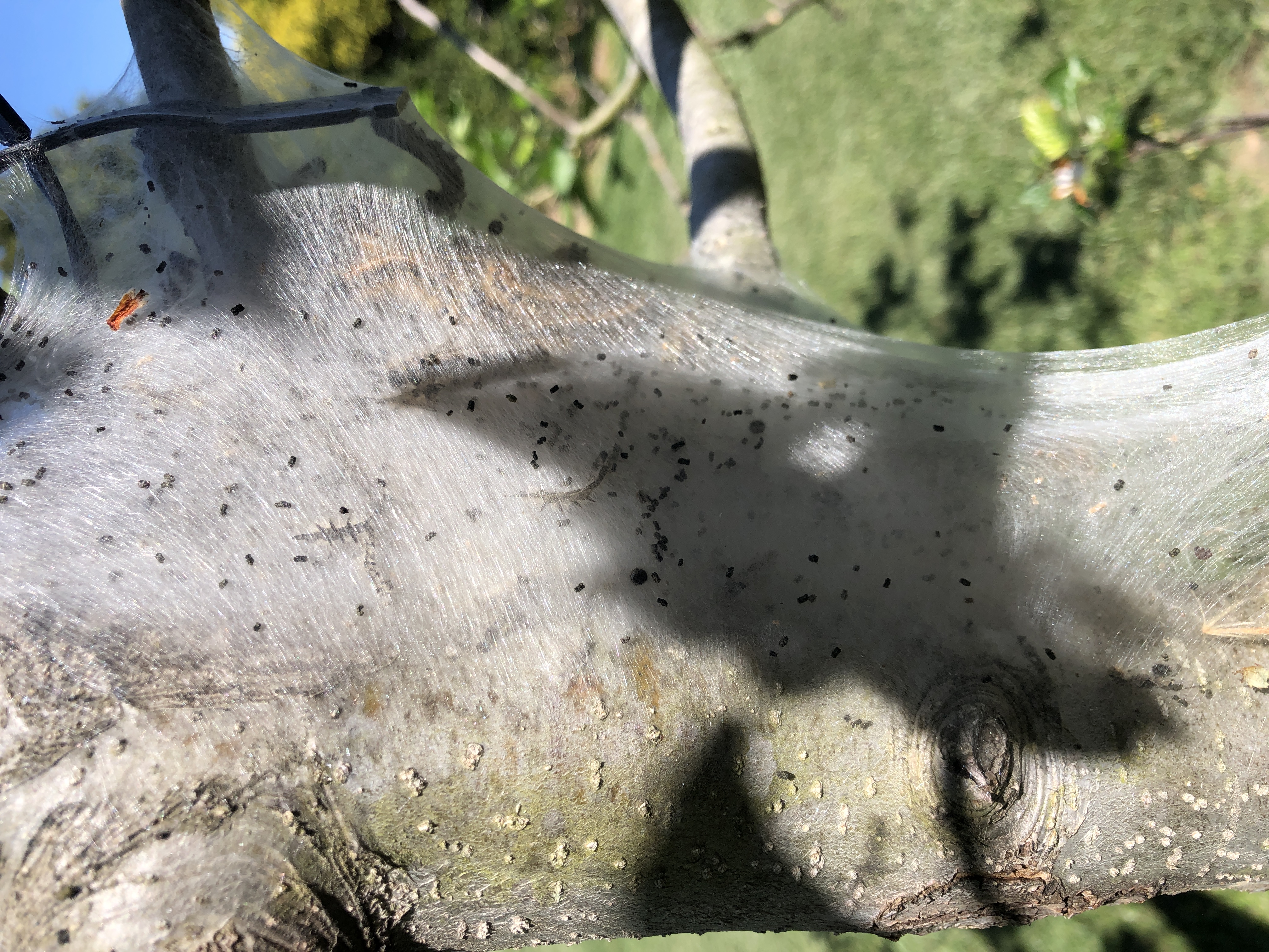 Wherever the larvae crawl, they leave a fine thread of silk behind. After a few days, you can easily see silken pathways from the webs to the first good feeding site.