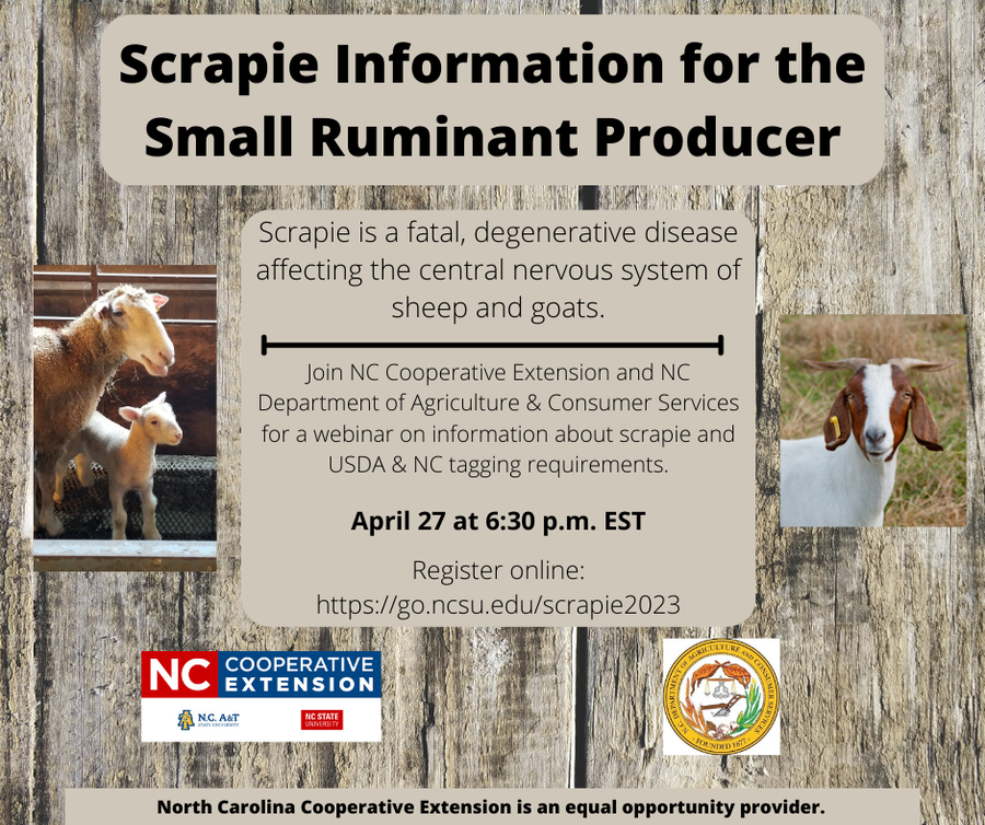 Join N.C. Cooperative Extension and NC Department of Agriculture & Consumer Services for a webinar on information about scrapie and USDA & NC tagging requirements on Thursday, April 27 at 6:30 p.m.
